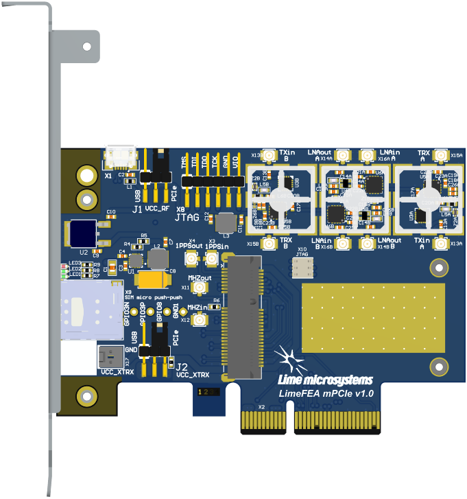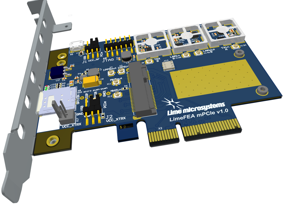 The LimeFEA mPCIe is 2 lane PCIe to mini PCIe adapter that provides a hardware platform for developing and prototyping high-performance designs with mini PCIe cards. It comes equipped with RF front end (RFFE) that is compatible with LimeSDR XTRX.