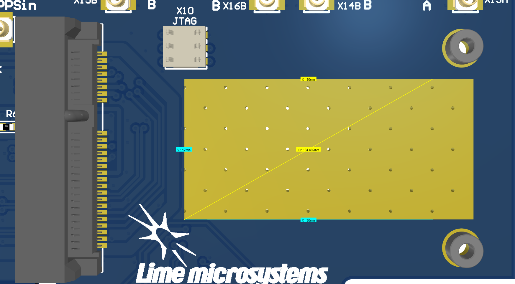 RF path contains U.FL connectors (X13A/B, X14A/B) used for internal connections (for example to connect to LimeSDR XTRX mini PCIe expansion board) and (X15A/B, X16A/B) connecting antennas.