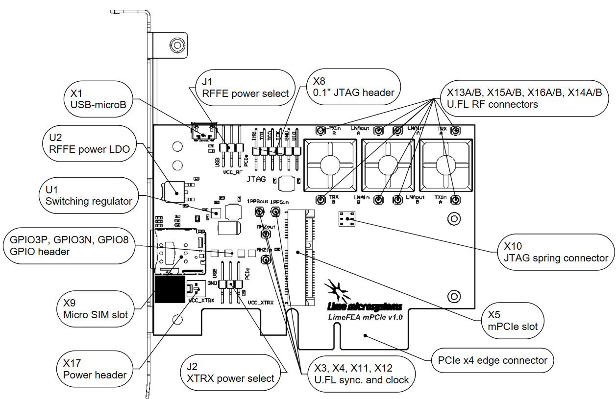 Figure 5: LimeFEA mPCIe v1.0 connectors and main components