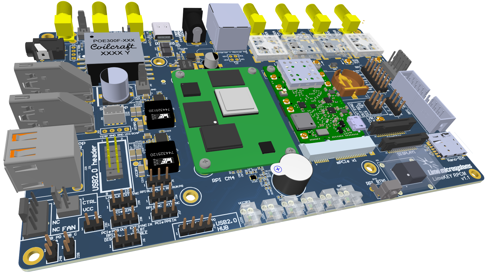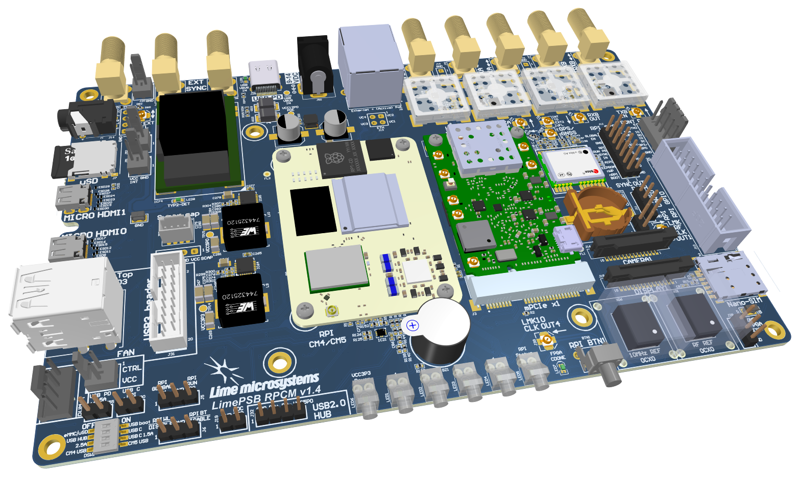 The LimePSB RPCM is carrier board for Raspberry Pi Compute Module and mPCIe card (by default LimeSDR XTRX board). LimePSB RPCM carrier board provides a hardware platform for developing and prototyping high-performance designs based on Raspberry Pi CM4 or CM5, RF front end, clock network and mPCIe card. It allows user to use the board in SDR, LoRa and other applications.