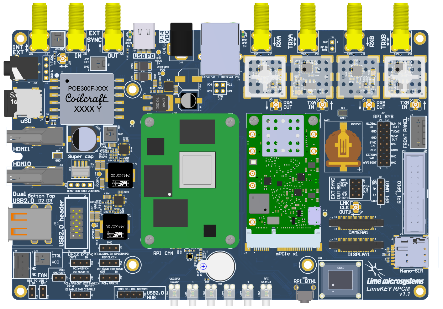 The LimePSB RPCM is carrier board for Raspberry Pi Compute Module 4 (CM4) and mPCIe card (by default LimeSDR XTRX board). LimePSB RPCM carrier board provides a hardware platform for developing and prototyping high-performance designs based on Raspberry Pi CM4, RF front end, clock network and mPCIe card. It allows user to use the board in SDR, LoRa and other applications.