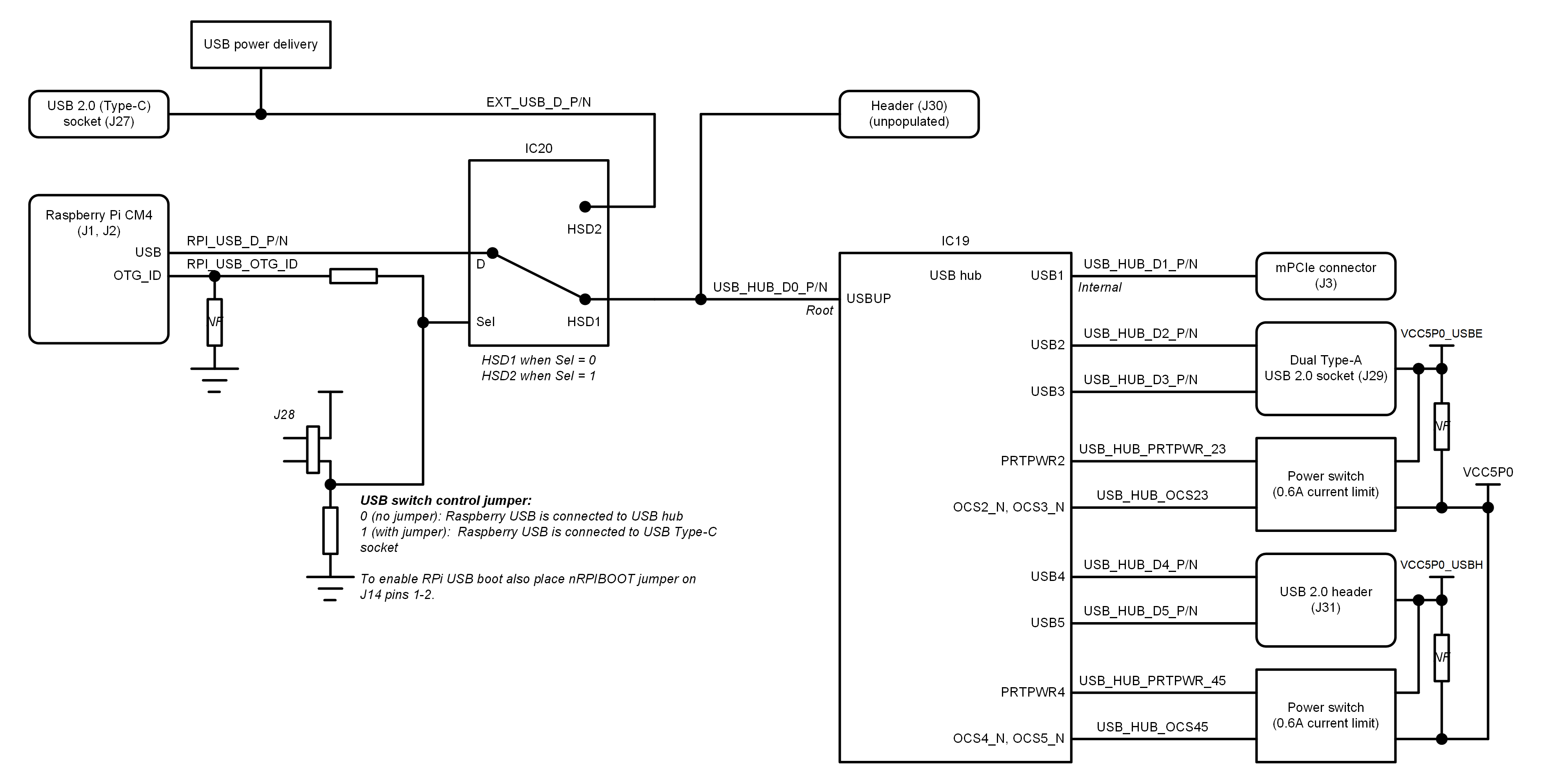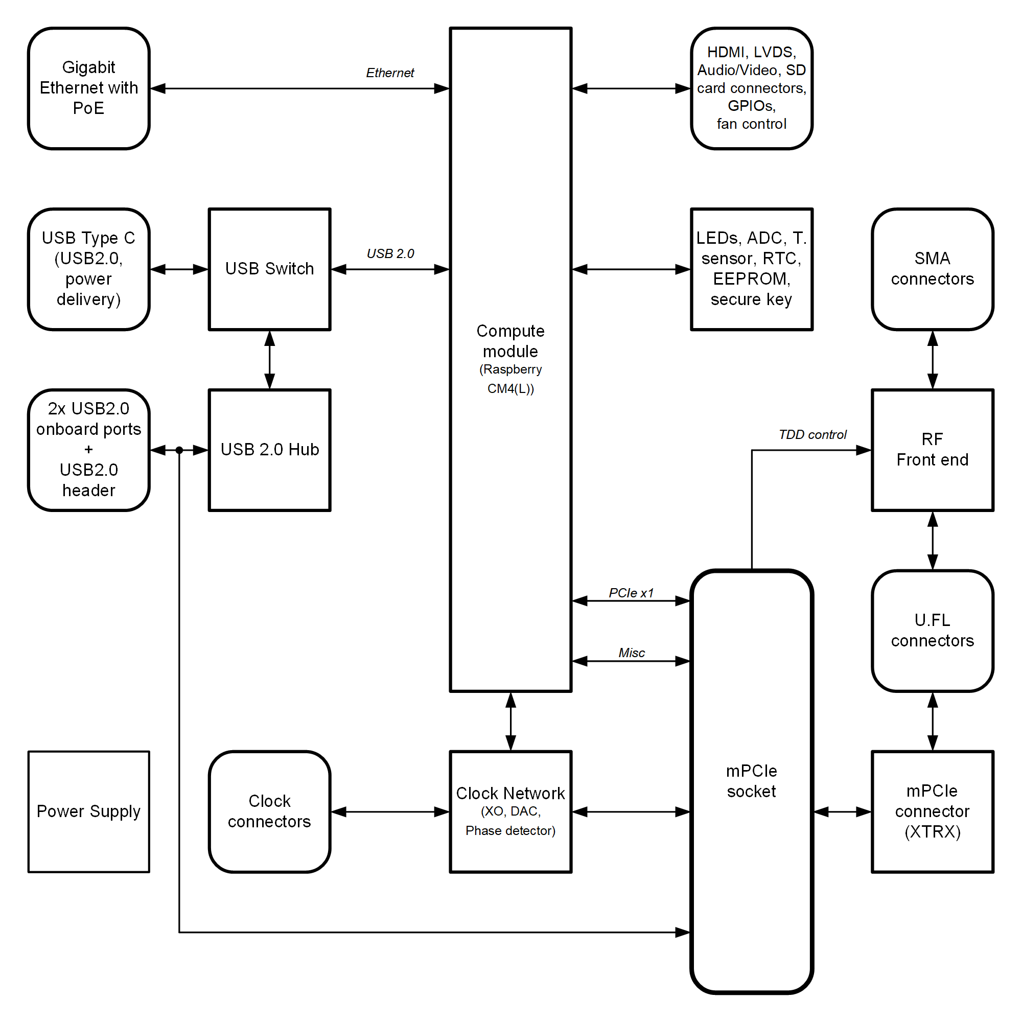 The heart of the LimePSB RPCM carrier board is Raspberry PI Compute Module 4 which may be used to transfer digital data between the CM4 and mPCIe board while performing data processing. The block diagram for LimePSB RPCM board is as shown in Figure 3.
