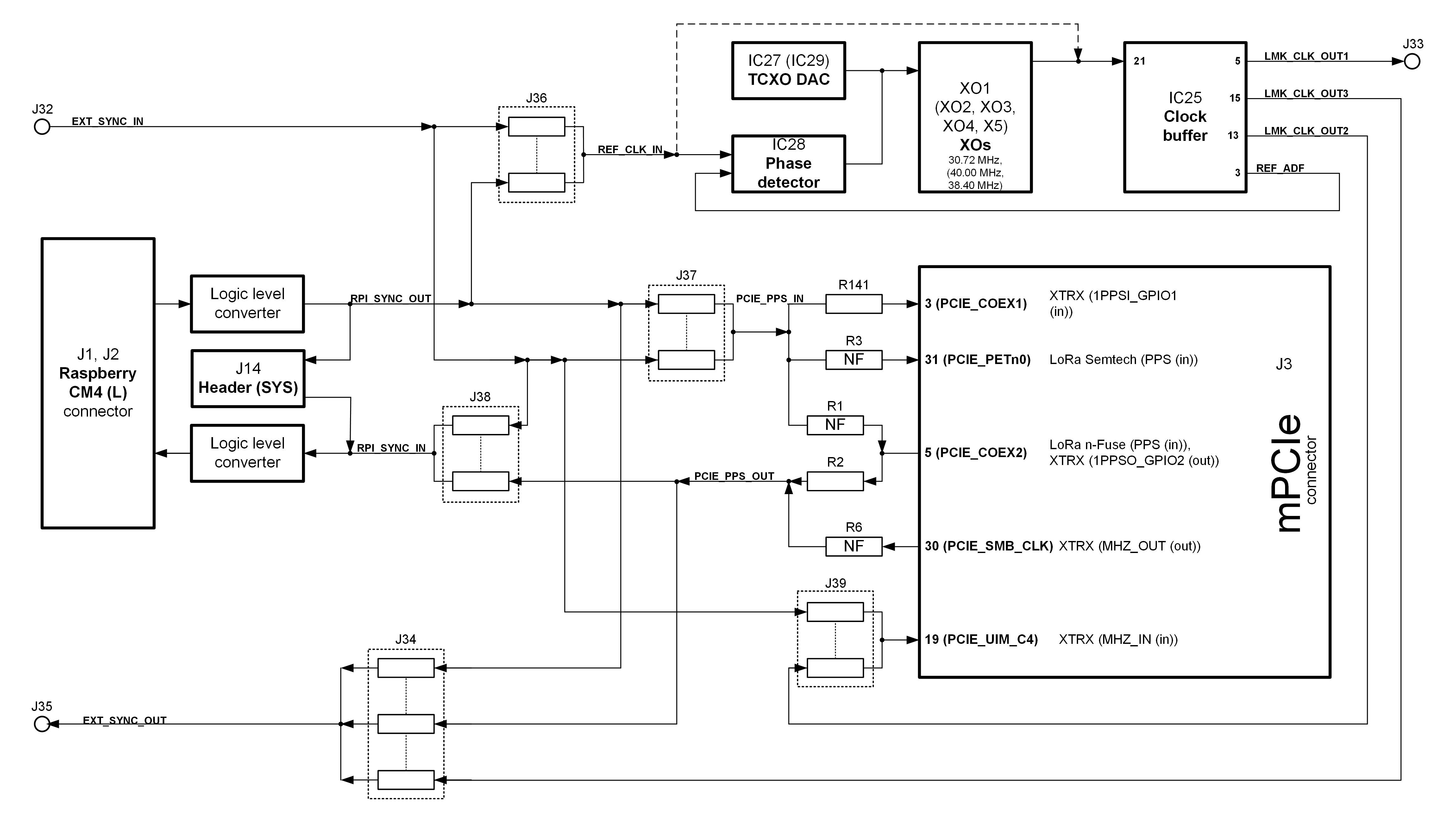 LimePSB RPCM board distributes reference clock to and from Raspberry Pi Compute Module 4, mini PCIe connector and external sources. It is possible to connect external reference clock and PPS signals to and from another boards or systems via J32 (EXT_SYNC_IN) and J35 (EXT_SYNC_OUT) connectors. Clock path may be configured using jumpers and resistors as described in Table 18.