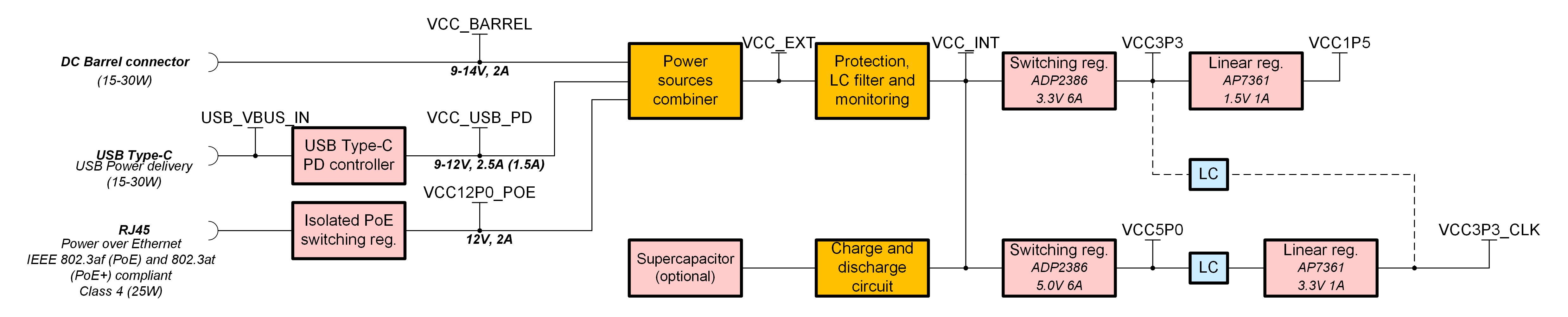 LimePSB RPCM board may be supplied from USB Type-C port (USB Power delivery), Ethernet RJ45 port (PoE) or barrel DC connector (9-14V):