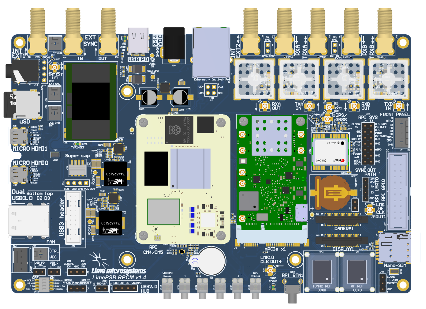The LimePSB RPCM is carrier board for Raspberry Pi Compute Module 4 or 5 (CM4 or CM5) and mPCIe card (by default LimeSDR XTRX board). LimePSB RPCM carrier board provides a hardware platform for developing and prototyping high-performance designs based on Raspberry Pi CM4 or CM5, RF front end, clock network and mPCIe card. It allows user to use the board in SDR, LoRa and other applications.