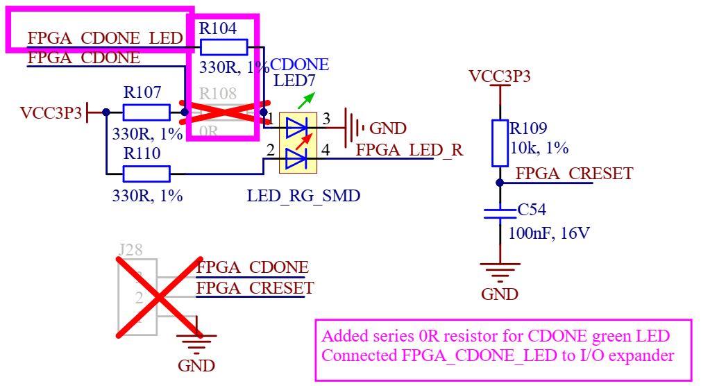 Added FPGA_CDONE signal to EXP2 for monitoring purposes. Also 0R was added as a option to disconnect FPGA LED from FPGA_CDONE signal when monitoring by RPI is required. In this case FPGA LED can still indicate CDONE by EXP2 GPB2 pin (FPGA_CDONE_LED). FPGA LED changes are shown in Figure 20.