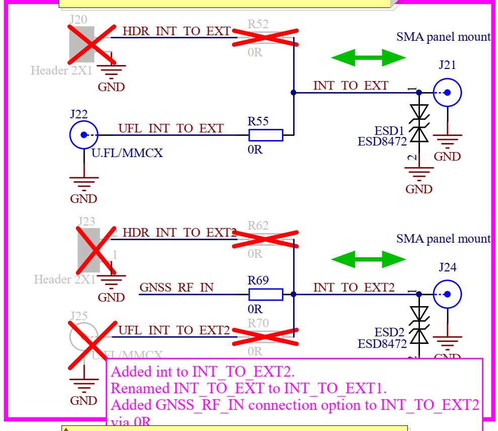 Added Internal U.FL to external SMA connector (EXT2) and renamed old internal U.FL to external SMA connectors to EXT1. New EXT2 SMA connector can be directly connected to on board GNSS module (IC48) RF_IN pin (default) as shown in Figure 19.