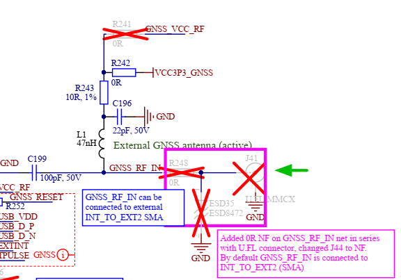 Added 0R NF on GNSS_RF_IN net in series with U.FL connector and changed J44 to NF. By default GNSS_RF_IN is connected to INT_TO_EXT2 (SMA) as shown in Figure 25.
