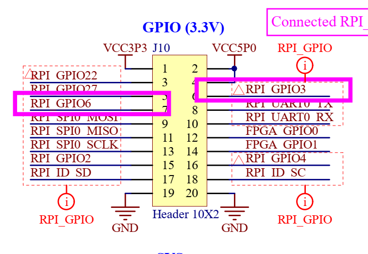 RPI_GPIO3 and RPI_GPIO6 connected to GPIO header (J10).