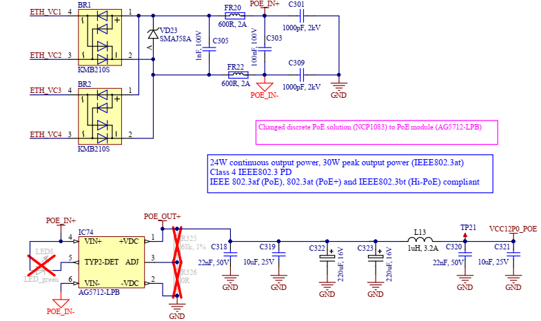 Changed discrete PoE solution (NCP1083) to PoE module (AG5712-LPB)