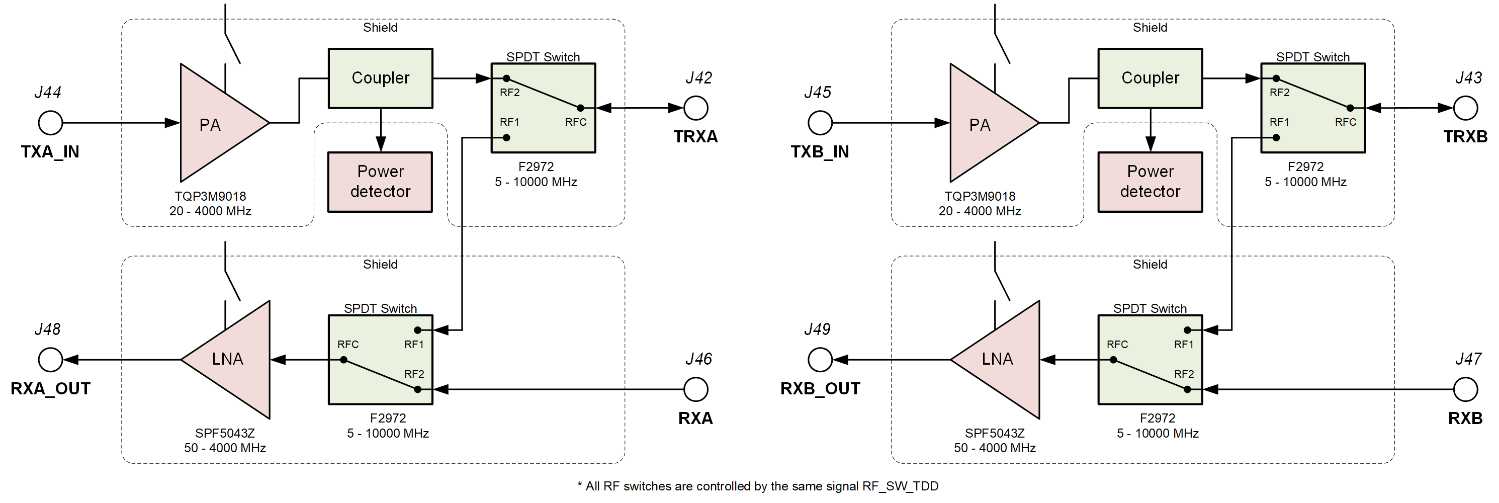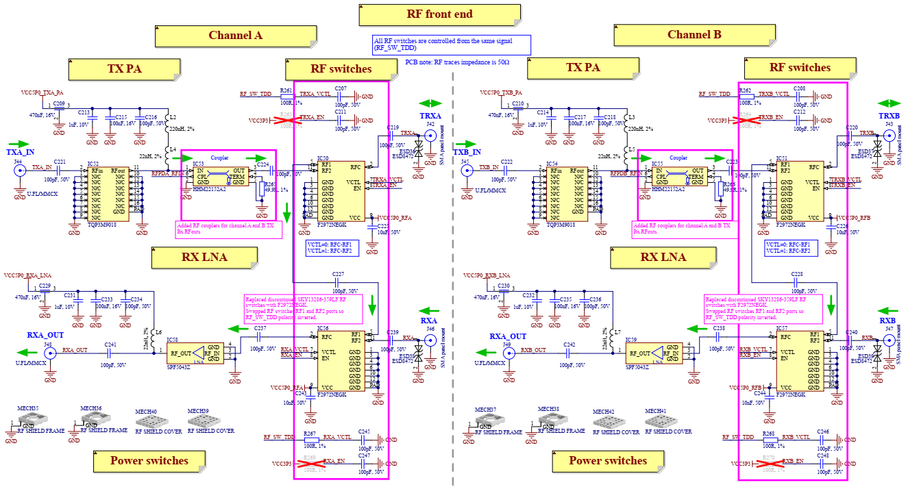 Replaced discontinued SKY13286-359LF RF switches with F2972NEGK. Swapped RF switches RF1 and RF2 ports so RF_SW_TDD polarity inverted.