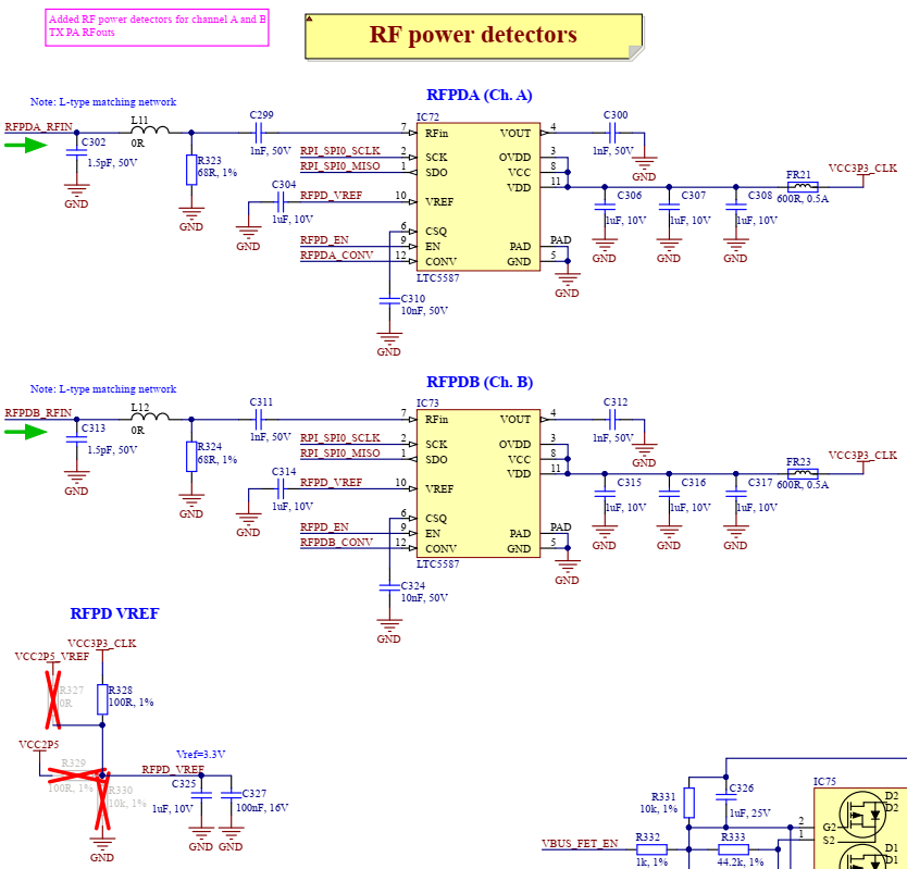 Added RF power detectors (LTC5587) for channel A and B TX PA RF outputs. RF power detector schematic is shown in Figure 29 .