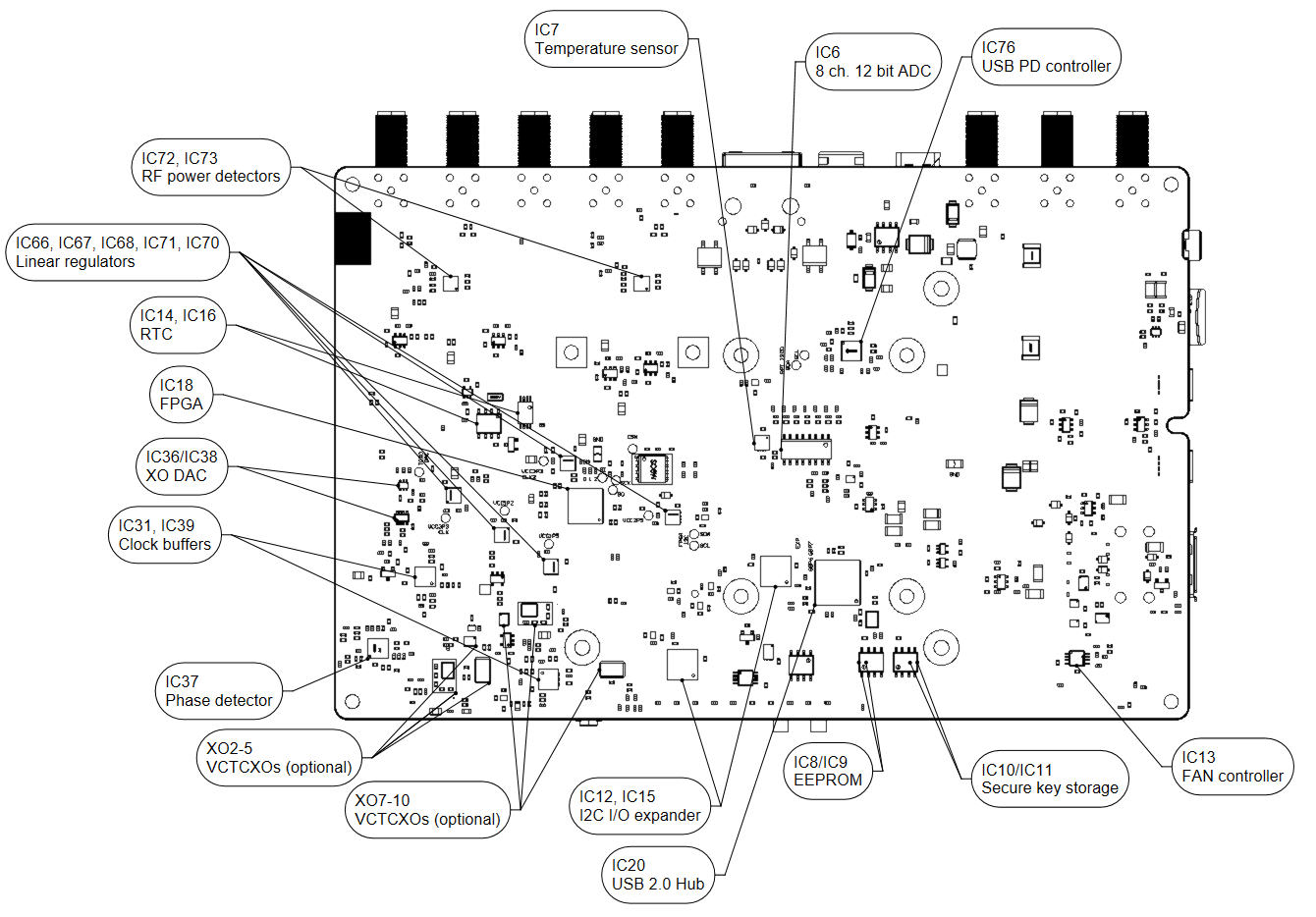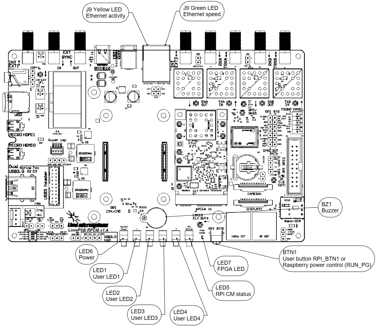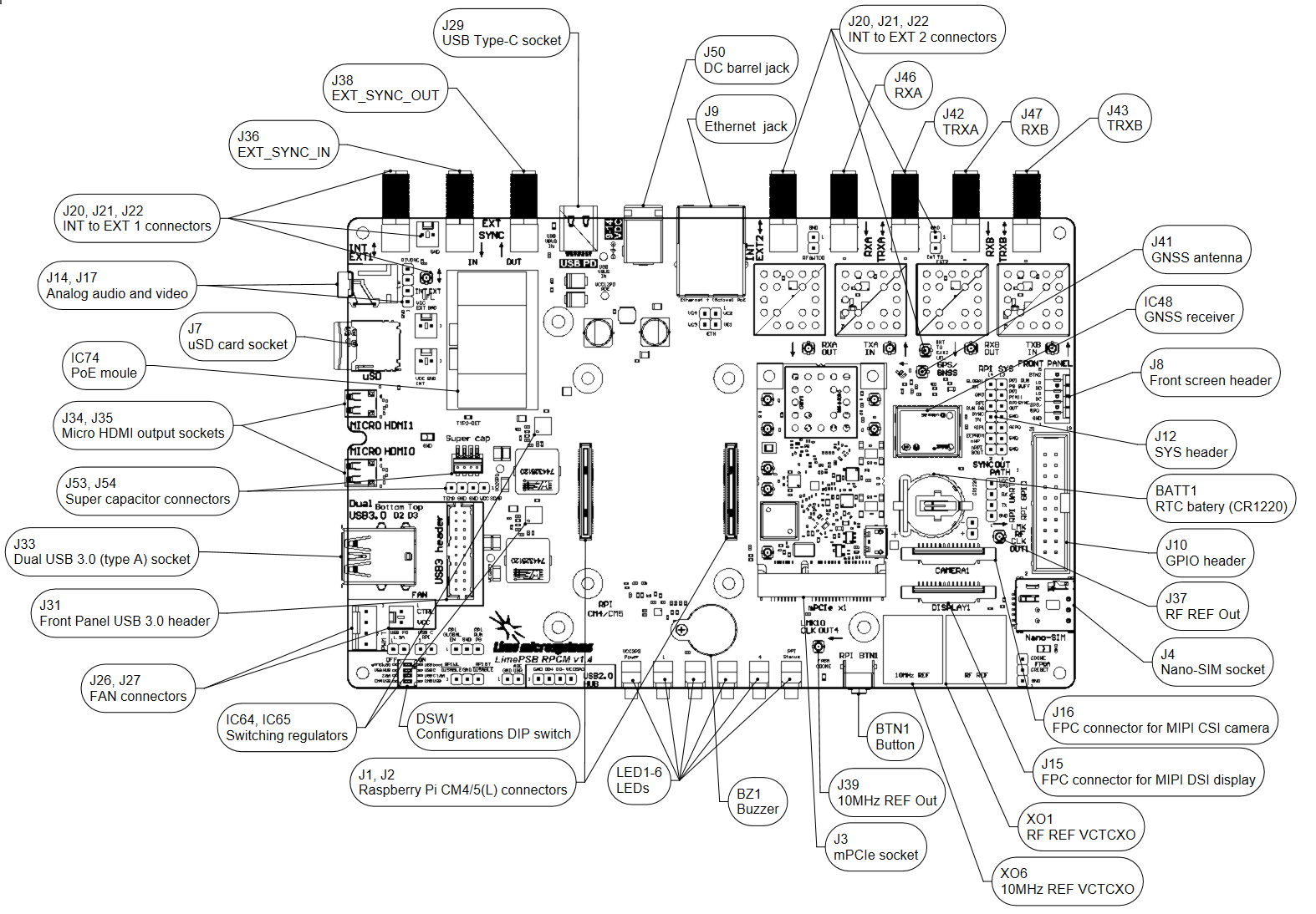 LimePSB RPCM board picture with highlighted connectors and main components are presented in Figure 4 and Figure 5.