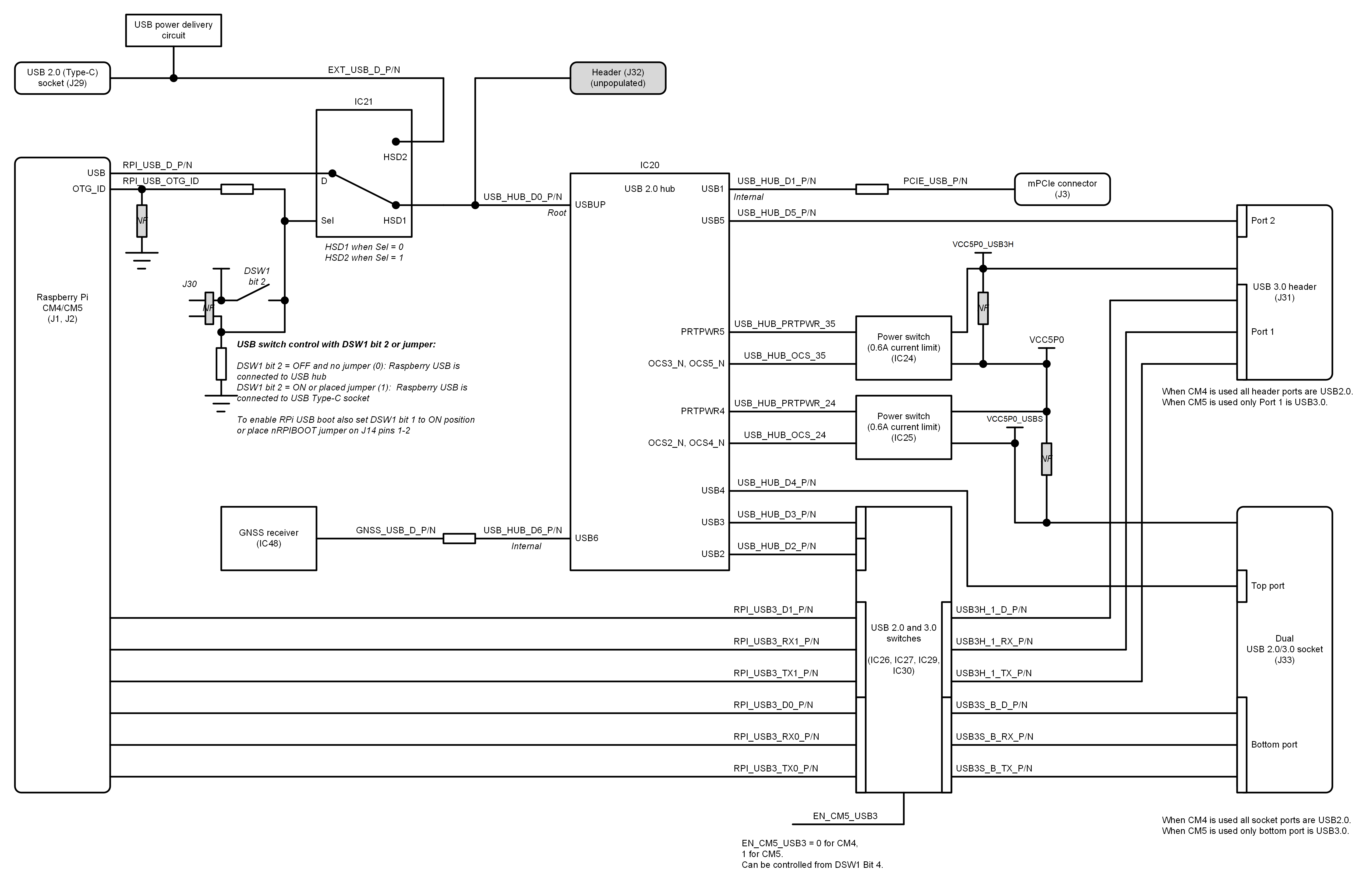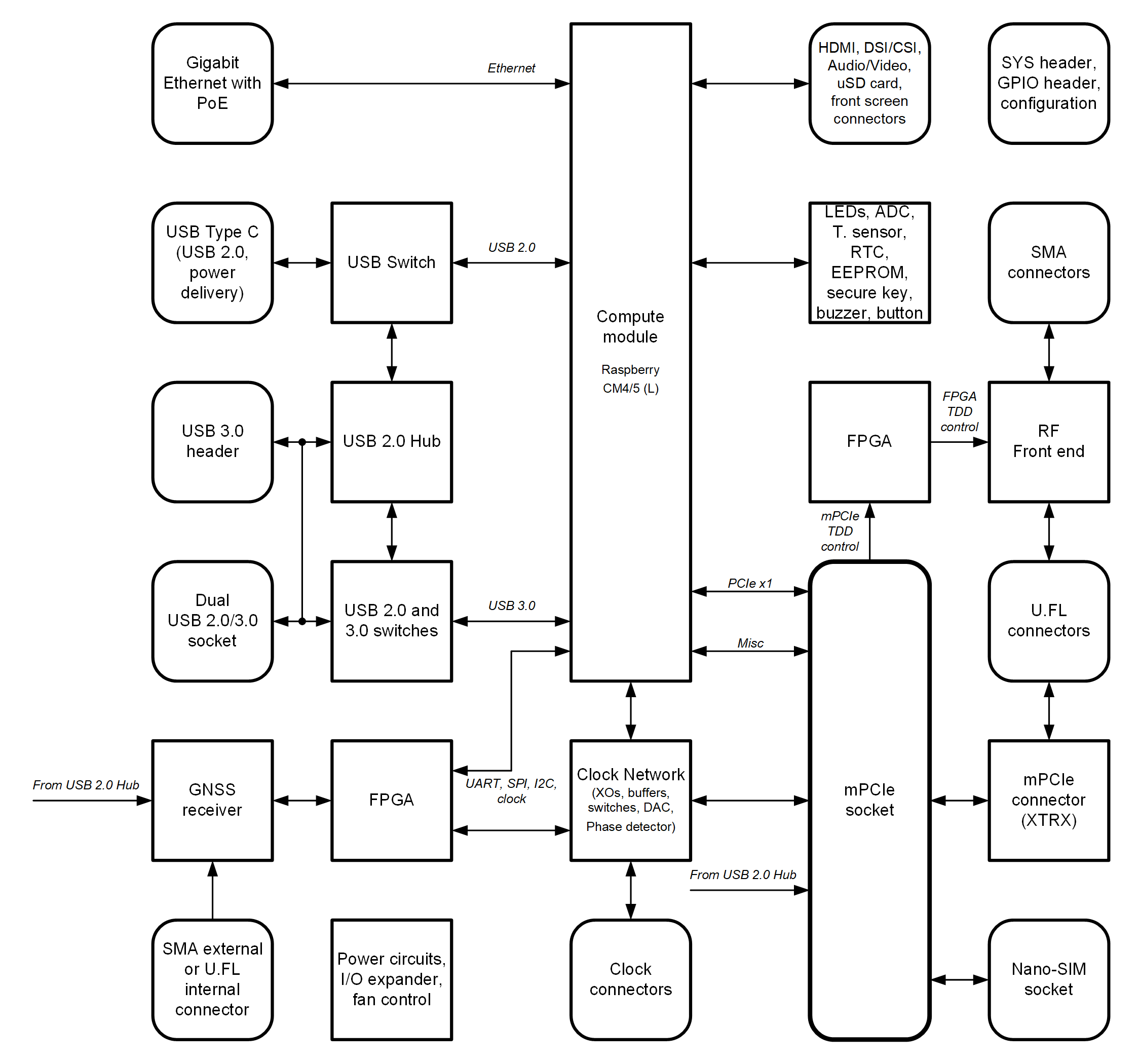 he heart of the LimePSB RPCM carrier board is Raspberry PI Compute Module 4 or Compute Module 5 which may be used to transfer digital data between the CM4/5 and mPCIe board while performing data processing. The block diagram for LimePSB RPCM board is as shown in Figure 3.