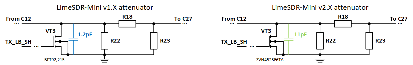 LimeSDR Mini v2.X encountered a change of shunt transistor VT3 in the RF feedback attenuator chain due to the original part becoming EOL. The original part BFT92,215 had a small output capacitance of around 1.2 pF, whereas the new RF transistor ZVN4525E6TA has a larger output capacitance of 11 pF. An extract of the schematic is presented in Figure 1.