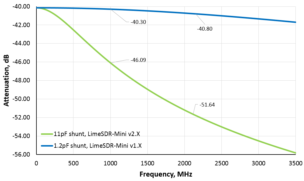 The increased shunt capacitance affects a frequency response of the attenuator. The attenuation is −46 dB at 1 GHz and −52 dB at 2.1 GHz for the new LimeSDR-Mini v2.X board. The frequency response shown in Figure 2 can be used as a reference RF loopback attenuation in the supported frequency range.