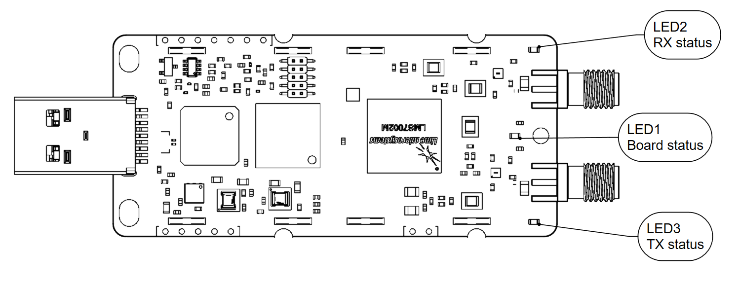 Figure 8. LimeSDR Mini v2.2 indication LEDs (top)