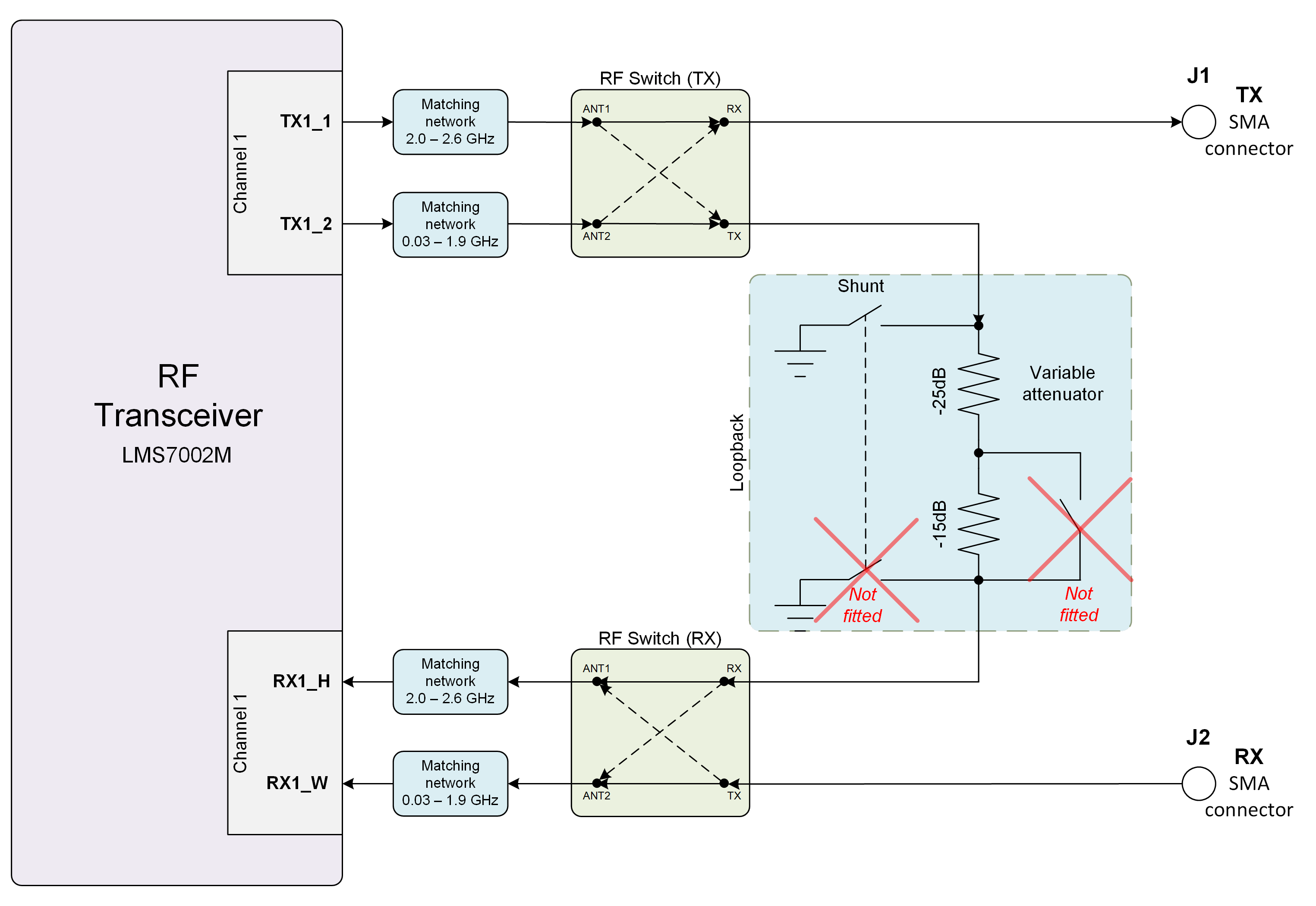 LimeSDR Mini RF network contains matching networks, RF switches, loopback variable attenuator and two SMA connectors (J1 - TX and J2 - RX) as shown in Figure 6.