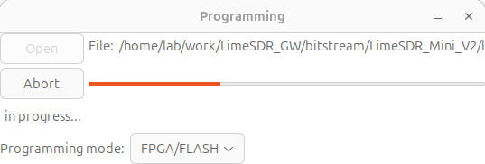 This section describes how to program the FPGA configuration FLASH memory on the LimeSDR Mini v2 board using Lime software.