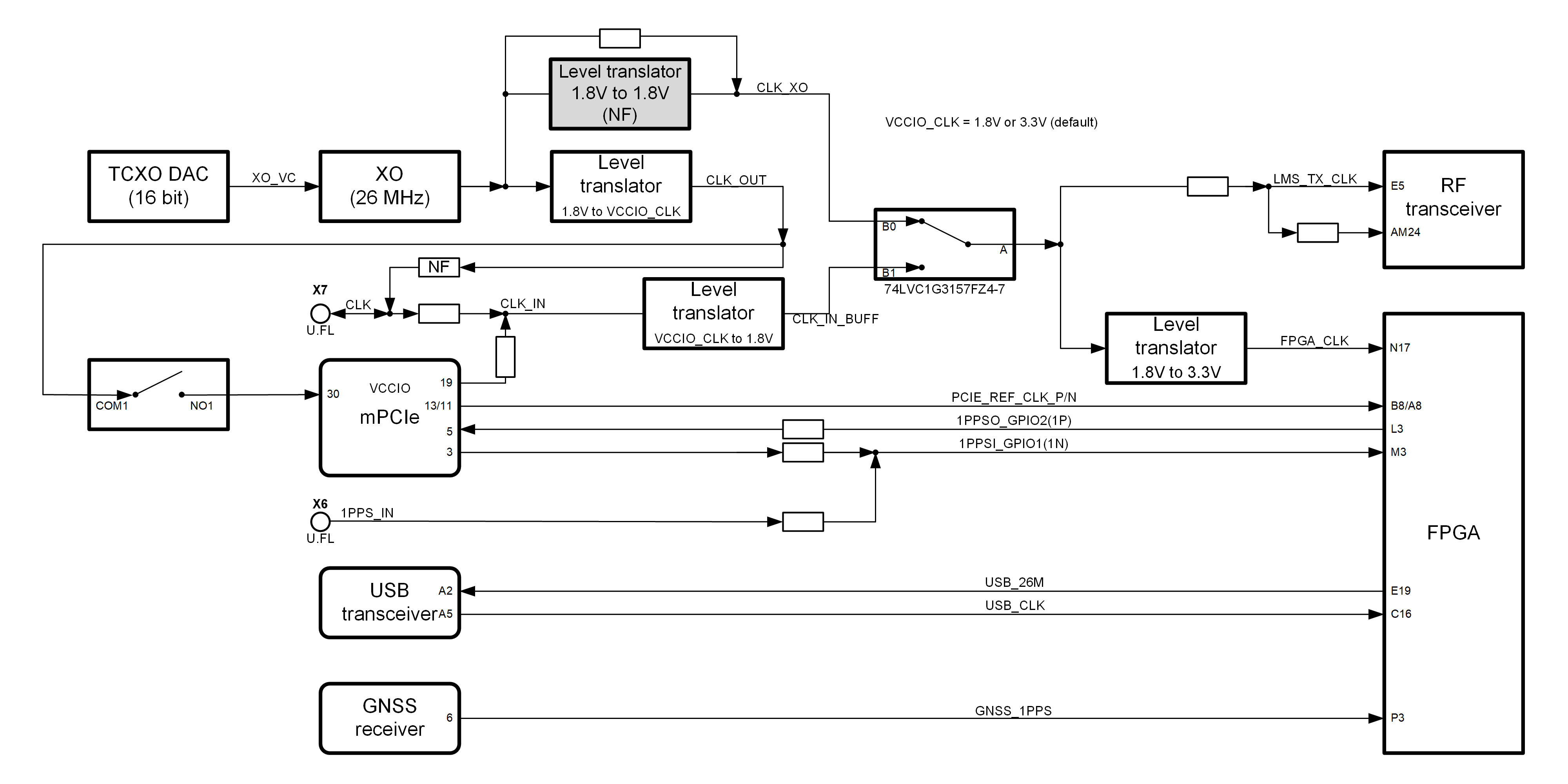 Analogue switch gives option to select clock source for RF transceiver and FPGA from buffered VCTCXO onboard clock XO1 (CLK_XO) and external U.FL (X7)/mPCIe (X10) sources (CLK_IN_BUFF). Buffered VCXO clock (CLK_OUT) can also be fed to other board using U.FL (X7)/mPCIe (X10)connectors.