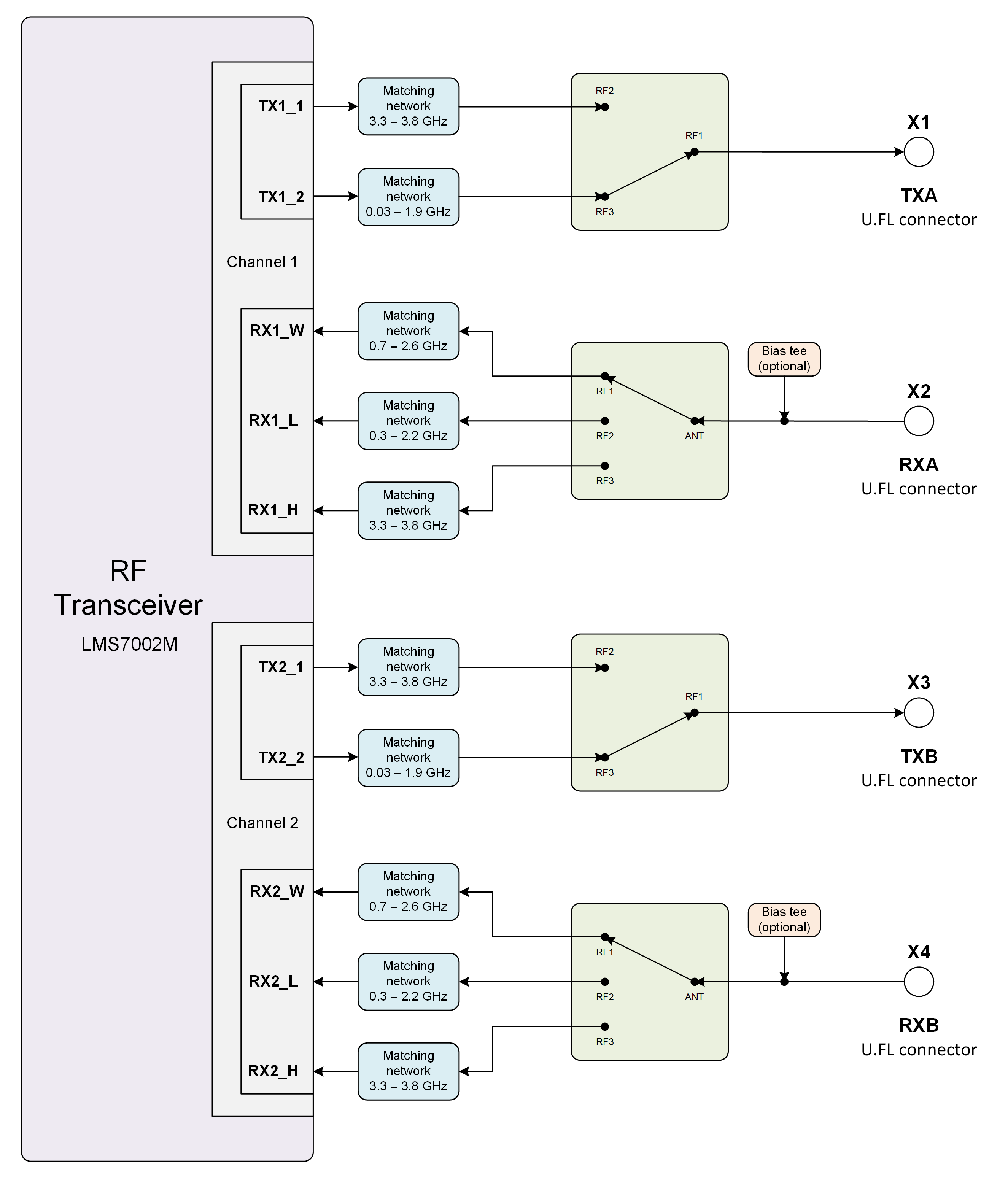 LimeSDR XTRX RF network contains matching networks, RF switches and U.FL connectors (X1, X3 - TX and X2, X4 - RX) as shown in Figure 6.
