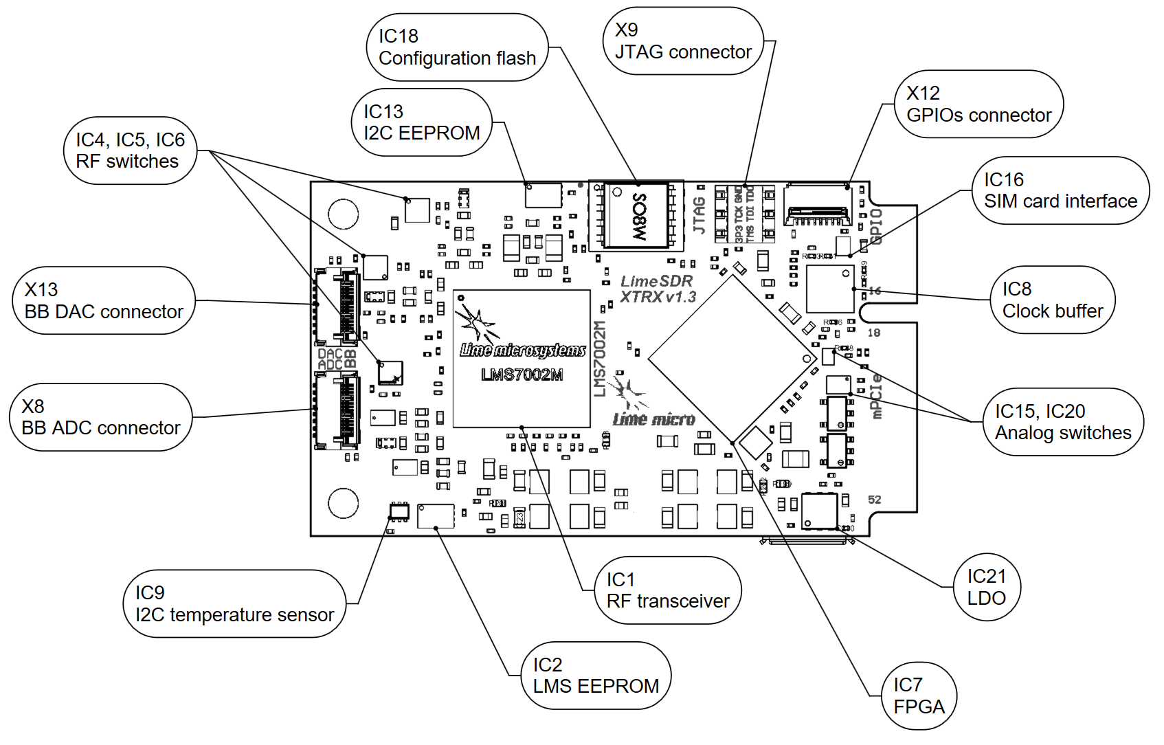 Figure 4: LimeSDR XTRX v1.3 board top connectors and main components